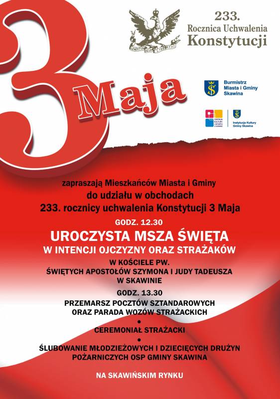Burmistrz Miasta i Gminy Skawina oraz Centrum Kultury i Sportu w Skawinie zapraszają na uroczyste obchody upamiętniające rocznicę uchwalenia Konstytucji 3-go Maja. Uroczystości rozpoczną się mszą św. w kościele pw. Św. App. Szymona i Judy Tadeusza w Skawinie o godz. 12.30. Po mszy św. organizatorzy zapraszają na skawiński Rynek na uroczyste obchody i program rozrywkowy.
