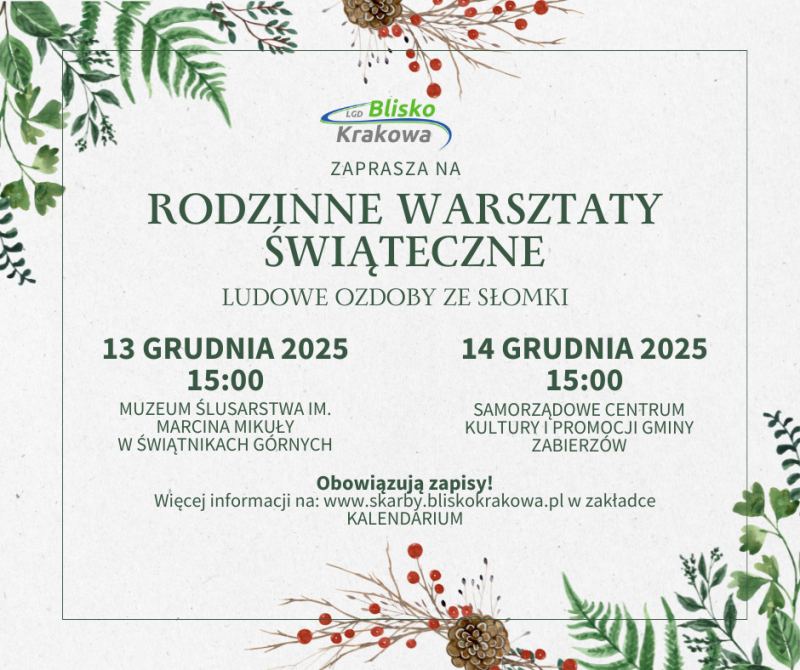 Wybierzcie się z nami w podróż do świata dawnych świątecznych tradycji! Podczas rodzinnych warsztatów odkryjecie, jak z prostych słomek powstają prawdziwe świąteczne skarby – delikatne gwiazdki, zawieszki i ozdoby, które kiedyś zdobiły wiejskie izby, a dziś mogą stać się wyjątkową dekoracją Waszego domu.