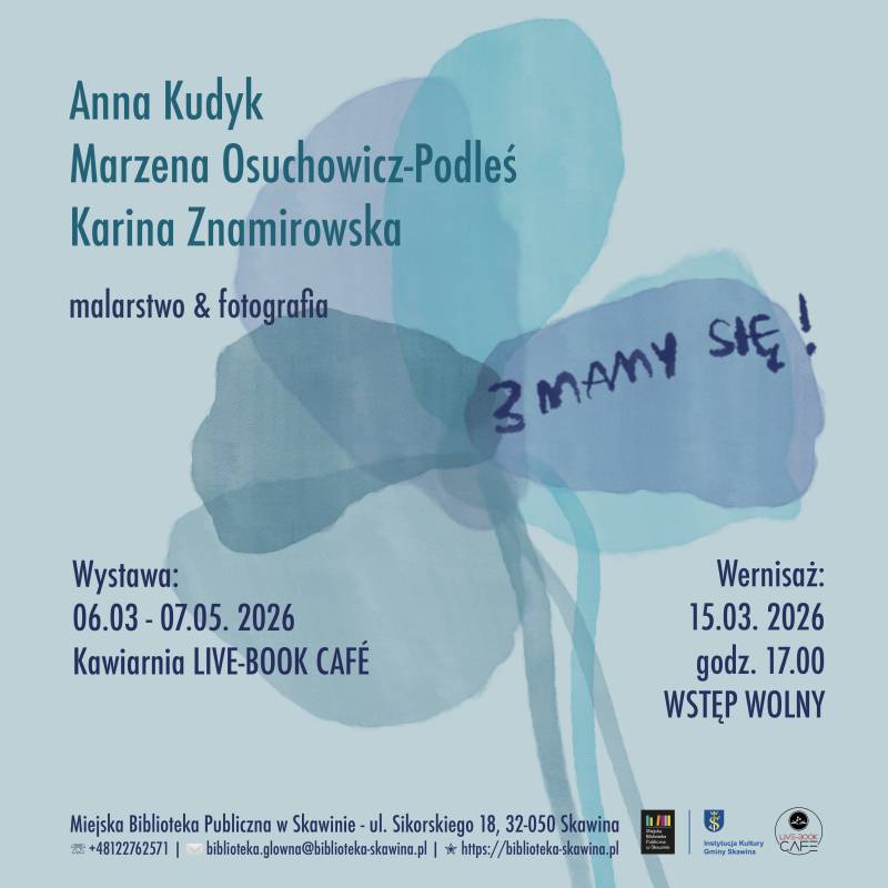 Biblioteka Miejska w Skawinie zaprasza na wernisaż wystawy "3 MAMY SIĘ", który odbędzię się 15 marca 2026 r. o godzinie 17:00. To podróż w głąb wrażliwości i pamięci wyrażona w malarstwie i fotografii. Wernisaż uświetni swoim występem duet jazzowy: Jakub Soczek (trąbka) i Bartosz Lala (klawisze).