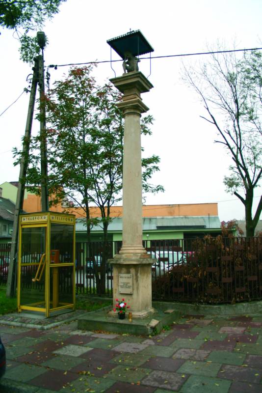 Figura powstała w 1826 roku. Kamienna rzeźba Chrystusa Frasobliwego umieszczona jest na wysokiej, ponad 4-metrowej kolumnie. Osłania ją metalowy, płaski daszek wsparty na 4 prętach. W jego szczycie metalowy krzyżyk. Kolumna typu toskańskiego wsparta jest na graniastym cokole, posadowionym na kwadratowej płycie. Chrystus ukazany jest w pozie siedzącej, z szeroko rozstawionymi nogami, lewą rękę opiera na kolanie, prawą podpiera głowę. Biodra Zbawiciela osłonięte są perisonium w formie chusty. Twarz o pogrubionych rysach, okolona zarostem. Powierzchnię kolumny pokrywa obrzutka cementowa z ozdobną fakturą.