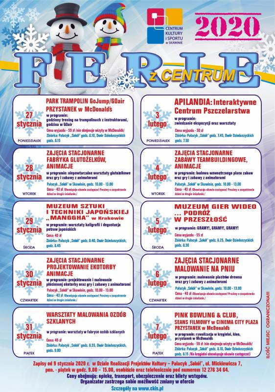 W tegorocznym cyklu zajęć pod hasłem „Ferie z Centrum 2020” proponujemy sześć wycieczek do atrakcji w Małopolsce oraz cztery propozycje zajęć stacjonarnych, dzięki którym zostaniemy m.in. szalonymi naukowcami w fabryce glutożelków oraz poznamy tajniki zabawy teambuildingowej. Nie pozwolimy Wam się nudzić w ten wolny od zajęć szkolnych czas.