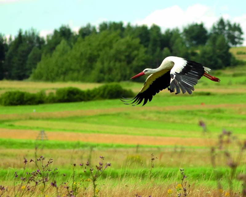 La piste a été nommée ainsi car on passe en chemin près de nombreux nids de cigognes. De mai à août, il est possible d'observer les cigognes dans les prés à Wołowice et Zagacie. L'itinéraire débute sur le parking au centre de Wołowice. Avant de partir, vous pouvez visiter l'exposition permanente d'objets d'osier àla Maison Populaire. Le manoir avec les vestiges du parc historique, transformé en école maternelle, est aussi intéressant. Le sentier serpente entre les maisons et les petites chapelles.