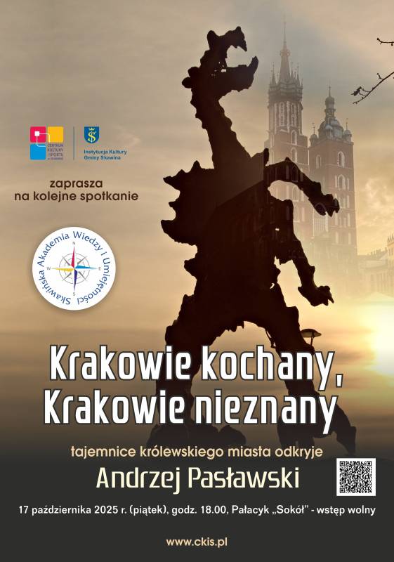 Podczas kolejnego wieczoru Skawińskiej Akademii Wiedzy i Umiejętności zapraszamy na jesienny spacer po Krakowie nieznanym i nieoczywistym z Andrzejem Pasławskim. Jako rodowity krakus przedstawi rodzinne miasto od zupełnie innej strony. Bez Wawelu, bez Kościoła Mariackiego, bez zatłoczonej do granic możliwości Grodzkiej i Floriańskiej…