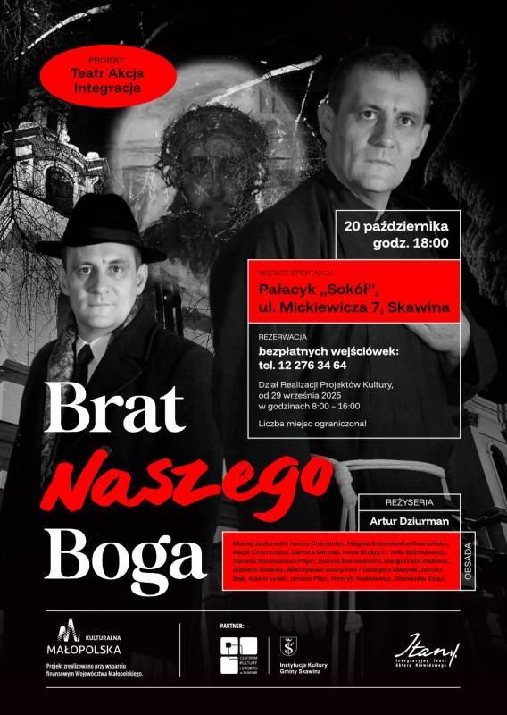 Zapraszamy serdecznie na spektakl „Brat naszego Boga” w wykonaniu wyjątkowego zespołu – Integracyjnego Teatru Aktora Niewidomego. Spektakl powstał na podstawie dramatu Karola Wojtyły, opowiadającego o krakowskim malarzu Adamie Chmielowskim, który porzuca sztukę, by poświęcić życie służbie najuboższym jako brat Albert. Motywem przewodnim przedstawienia jest obraz „Ecce Homo” autorstwa Chmielowskiego, ukazujący Jezusa w koronie cierniowej. Scenariusz i reżyseria: Artur Dziurman.