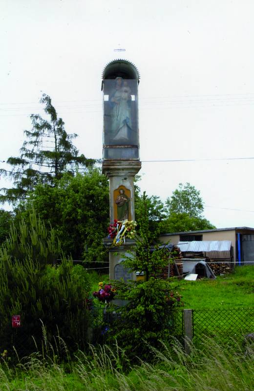 Kapliczka wzniesiona została w 1908 roku z fundacji Katarzyny Milc. Wykonana z piaskowca, dwukondygnacyjna, posadowiona na trójstopniowej podstawie. W ścianie frontowej dolnej kondygnacji inskrypcja. Boczne ściany z arkadkami wyciętymi w ośli grzbiet. W prawej z nich św. Franciszek Seraficki w brązowym habicie przepasanym sznurem, z dłońmi skrzyżowanymi na piersi, trzymający krzyżyk i różaniec. W lewej wnęce św. Antoni w brązowym habicie, z lilią i Dzieciątkiem Jezus. W tylnej wnęce św. Piotr i św. Jan Chrzciciel, stojący obok siebie, św. Piotr z kluczami i księgą, św. Jan Chrzciciel z krzyżem. We frontowej ścianie drugiej kondygnacji Chrystus z sercem gorejącym, w brązowej sukni i zielonym płaszczu. Prawą ręką błogosławi, lewą wskazuje na serce. W bocznych płaszczyznach św. Katarzyna z kołem i krzyżem oraz św. Michał Archanioł w zbroi, depczący leżącego szatana. Od północy św. Józef z lilią i Dzieciątkiem na lewej ręce. Postument zwieńczony blaszana kapliczka nakryta daszkiem o półokrągłej formie, od frontu ozdobiona zębatym fryzem. Frontowa ściana kapliczki oszklona. Na szczycie daszku żelazny, ażurowy krzyż. W kapliczce figura Matki Boskiej z Dzieciątkiem. Maria ubrana jest w białą suknię, jasnoniebieski płaszcz z ciemnoniebieską podszewką i złotą lamówką. Stoi na globie, na lewej ręce trzyma Chrystusa, a prawą czyni gest błogosławieństwa. Ogrodzenie kapliczki wykonane z pionowych prętów zakończonych płomieniami, pomiędzy nimi pręty niższe, skręcone w części środkowej.