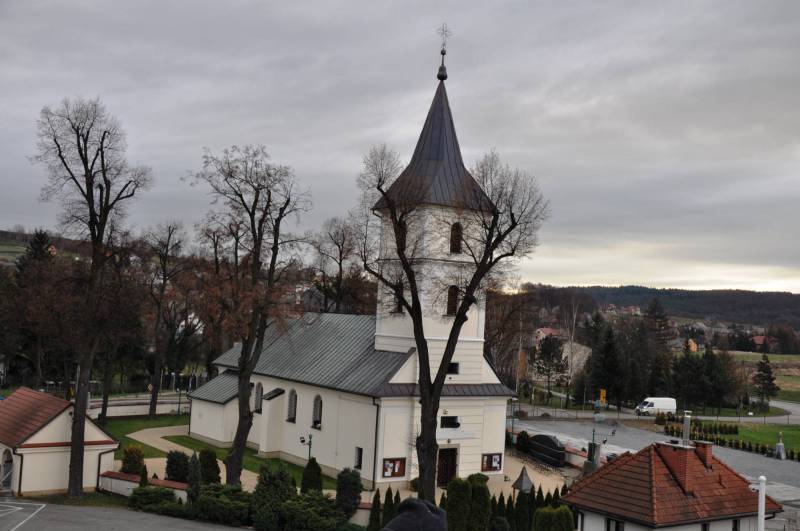 La paroisse fut fondée avant 1325. L’église paroissiale actuelle St. Laurent et Ste Catherine fut construite au XVe s, sur les restes de la précédente. Lors d’un incendie en 1844, une partie du décor intérieur brûla et le plafond s’effondra. La restauration de l’église dura trois ans. La nouvelle église, couverte de tuiles, fut construite dans le style classique. L’église n’a pas de chapelles latérales, seulement une sacristie et un porche sud. Les origines du mobilier de l’église ne sont pas clairement définies, mais le maître-autel provient probablement de l’église des Franciscains à Cracovie, et l’autel latéral droit de Sainte Catherine vient probablement de l’église Ste Catherine à Cracovie. Les fonts baptismaux en pierre baroques de la seconde moitié du XVIIe siècle sont probablement le seul élément original de l’ancienne église.